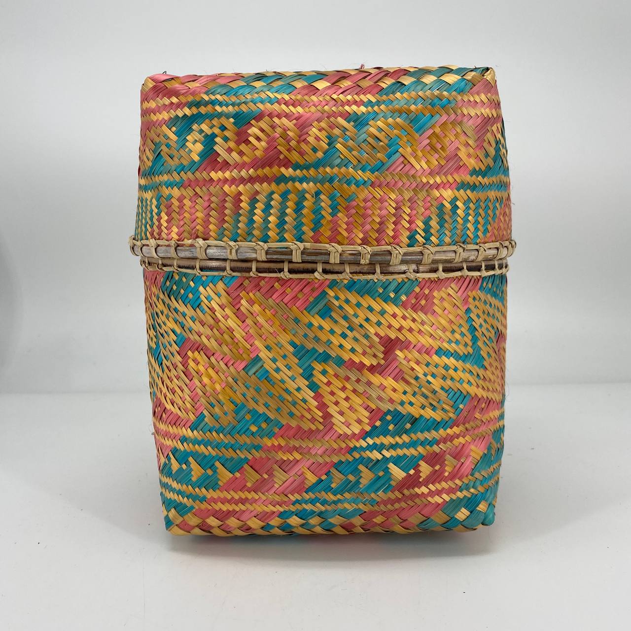 This beautiful handwoven bamboo box with lid was made by Iban artisan Bejau Anak Merom.