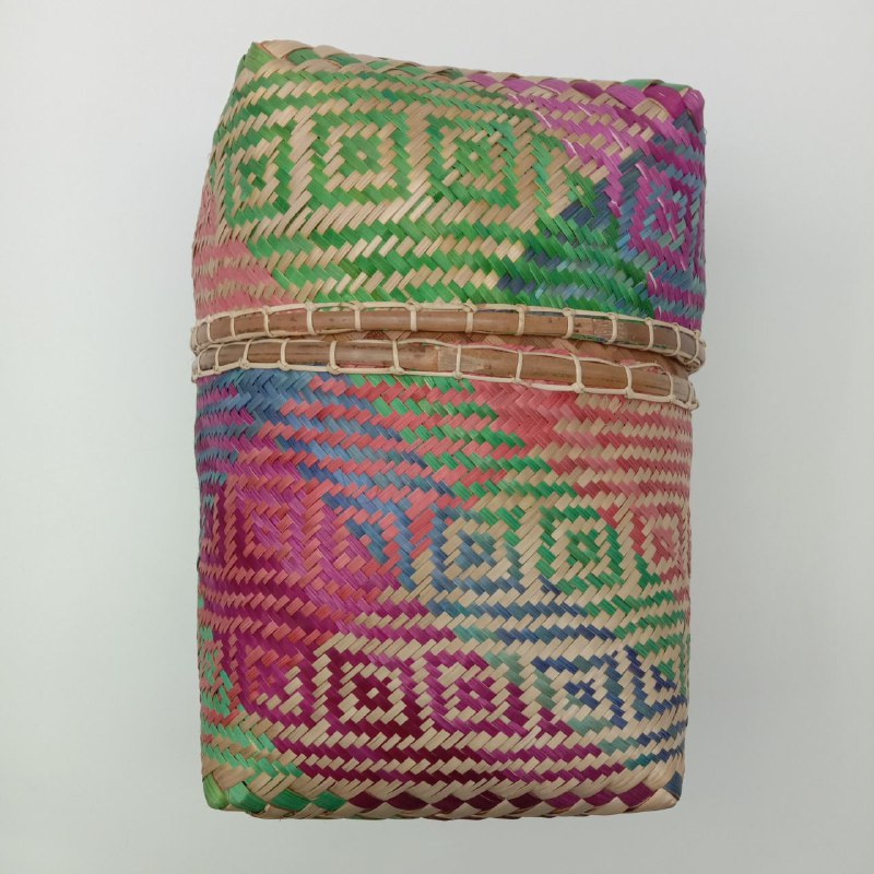 This beautiful handwoven bamboo box with lid was made by Iban artisan Jelembai.